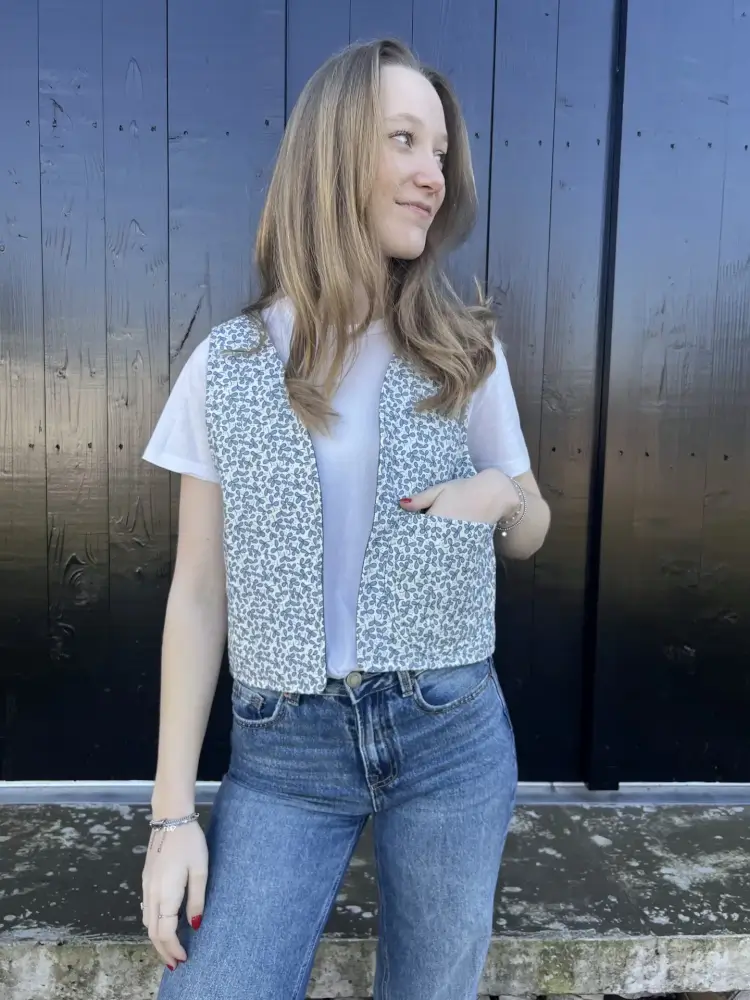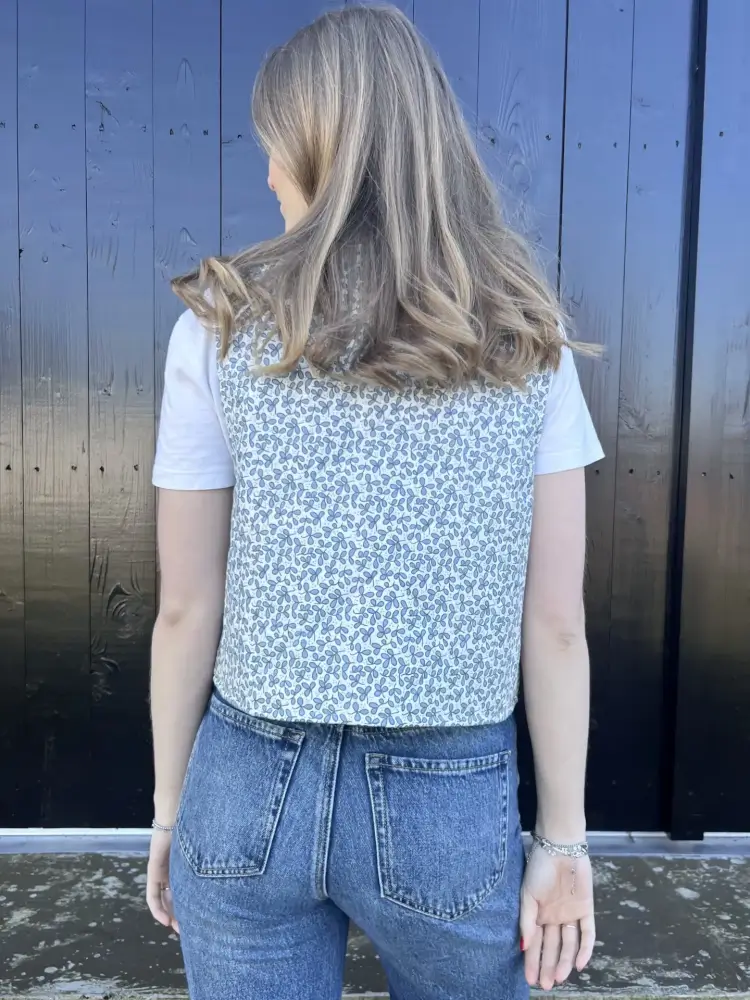 Deze tweedehands sprei met kleine blauwe bloemetjes is gecombineerd met een donkerblauwe stof van gerecyclede katoen. Deze is geproduceerd bij weverij Enschede Textielstad. Op de voorkant is een zakje opgestikt, super handig voor bijvoorbeeld je sleutels of telefoon. Het vestje kan aan twee kanten gedragen worden. Van deze sprei zijn verschillende vestjes en jasjes gemaakt waar er nu nog twee van op voorraad zijn, dus wees er snel bij!